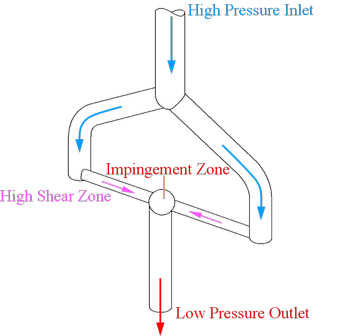 The principle is that after the liquid-liquid or solid-liquid suspension sample is pressurized by the power unit, it is partially accelerated through the front channel of the diamond interactive cavity. The jet speed reaches 500m/s when it reaches the diamond channel. The high-speed jet like a bullet passes through the fixed shape of the diamond microchannel. Through high-frequency shearing + impact + collision + anti-blasting between material particles + huge pressure drop (up to 2000bar or higher), the material particle size is finally refined and uniform.